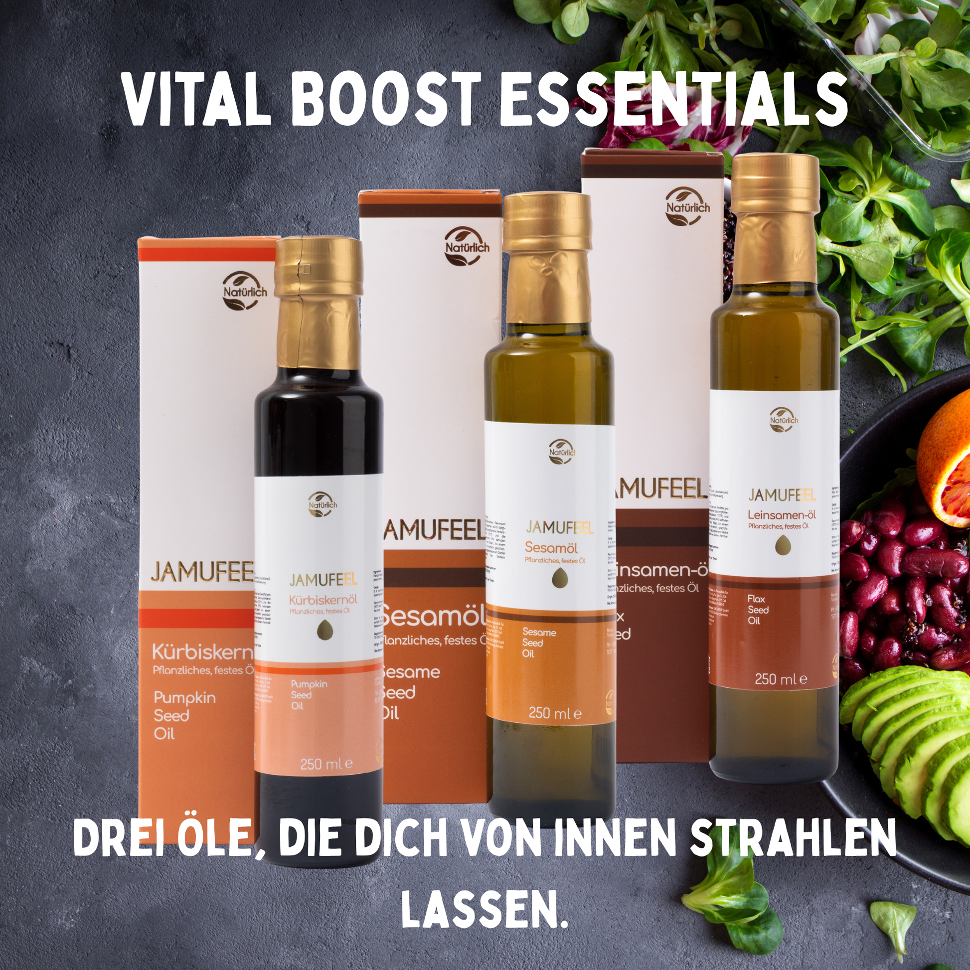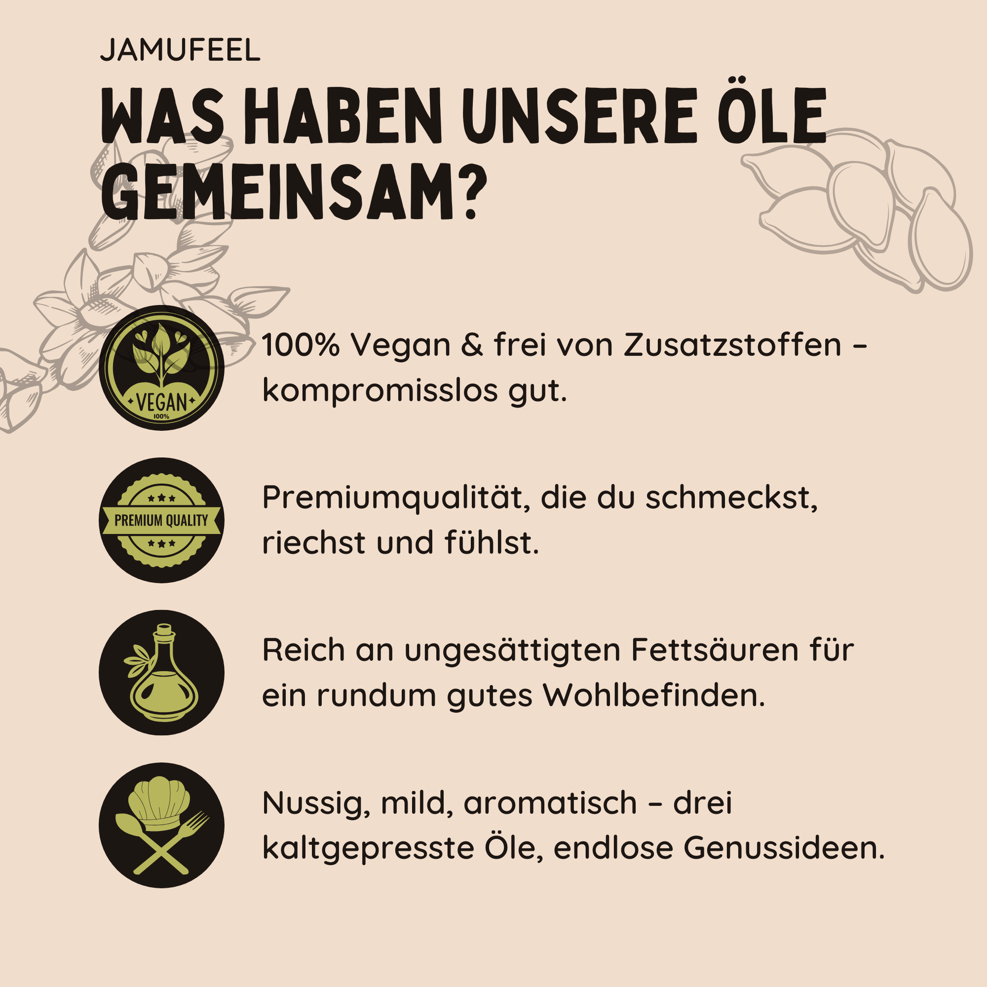 Entdecke die pure Kraft der Natur in drei exklusiven Flaschen: Sesamöl, Leinsamenöl und Kürbiskernöl – 100% naturrein und schonend kaltgepresst, um das volle Aroma und alle wertvollen Nährstoffe zu bewahren. Ob für knackige Salate, cremige Smoothies oder aromatische Dips – jedes Öl bringt seinen eigenen, unverwechselbaren Charakter auf den Teller: nussig, mild oder aromatisch – für endlose Genussideen in deiner Küche. Unsere Premiumqualität kannst du nicht nur schmecken, sondern auch riechen und sehen. Die Öle sind vegan, frei von Zusatzstoffen und reich an wertvollen ungesättigten Fettsäuren, die dir täglich mehr Vitalität, Ausgeglichenheit und Genuss schenken.